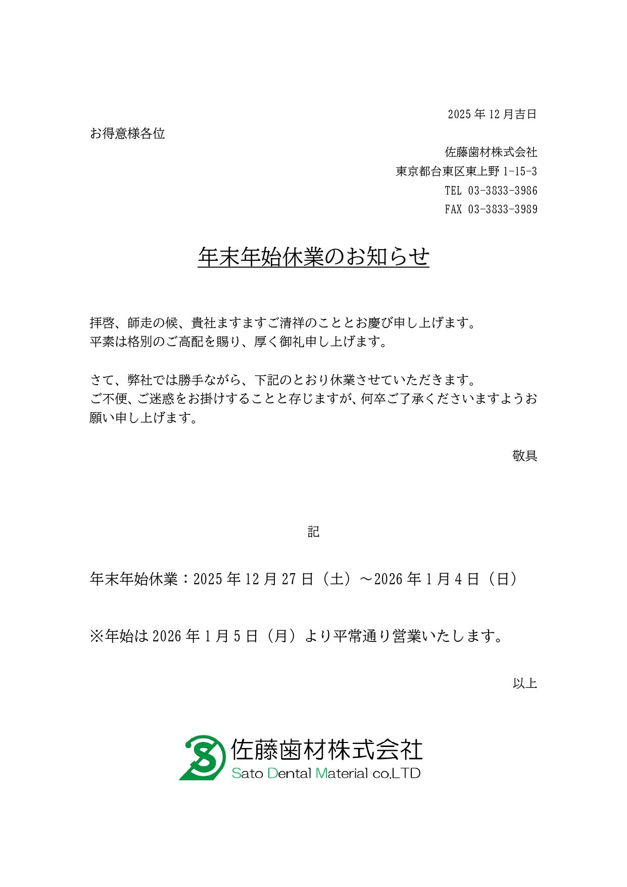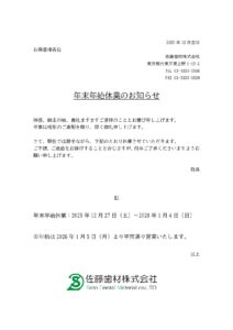 佐藤歯材(株)‗年末年始休業のご案内