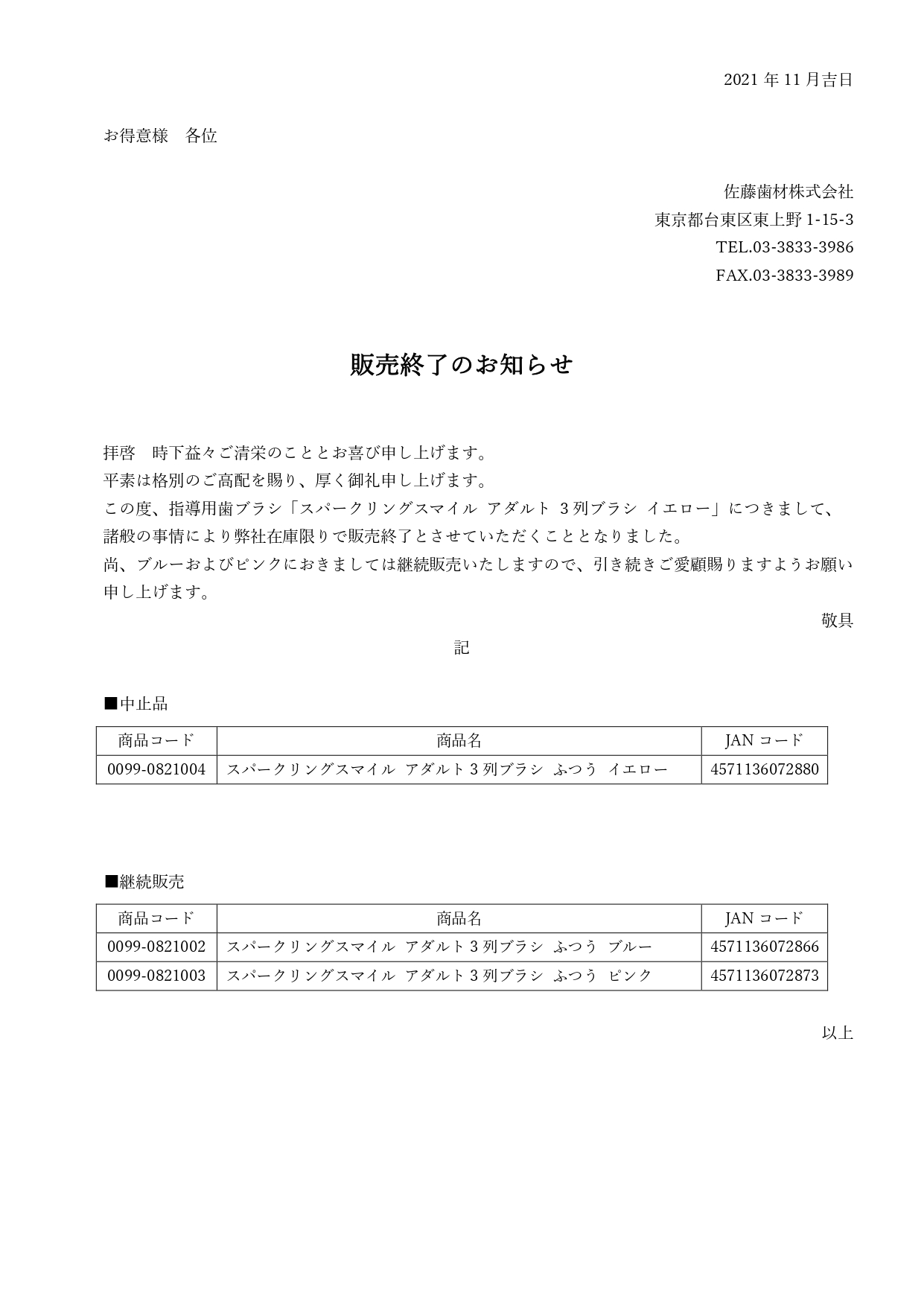 お知らせ「スパークリングスマイル アダルト3列ブラシ ふつう イエロー」販売終了のお知らせ 2021.11.18 お知らせ 「「スパークリングスマイル アダルト3列ブラシ ふつう イエロー」販売終了のお知らせ
