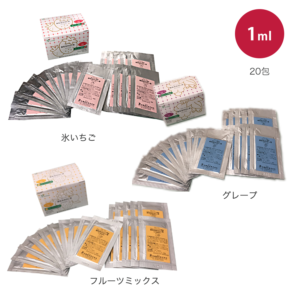 成分:水、キシリトール、食用赤色104号、食用青色1号(フルーツミックス、グレープのみ)、香料